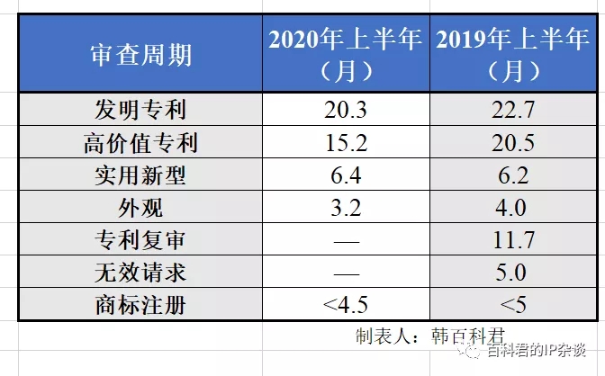 2019年上半年,我國發(fā)明專利審查周期為22.7個(gè)月,高價(jià)值專利審查周期為20.5個(gè)月,實(shí)用新型審查周期為6.2個(gè)月,外觀設(shè)計(jì)審查周期為4.0個(gè)月,專利復(fù)審請求審查周期為11.7個(gè)月,專利無效宣告請求審查周期為5.0個(gè)月。