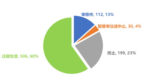截止到20221225日,科創板共計申報企業847家。其中注冊生效506家(上市497,終止(包括終止、終止注冊、不予注冊)199,審核中(包括已受理、已問詢、上市委會議通過、提交注冊)112家,暫緩審議或中止30家
