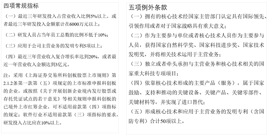 一般情況下,在科創板上市的企業需要同時滿足4項常規指標,如不能同時滿足,但能夠滿足5項例外條款之一的,同樣可以在科創板申請上市。