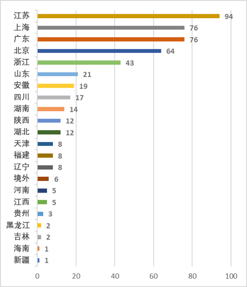 截止到20221225日,在科創板成功上市的企業中,注冊地排名前三的地區分別為江蘇(占比18.9%)、上海(占比15.3%)以及廣東(占比15.3%)。