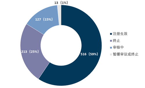 截至20233月14日,869家的申報狀態為:注冊生效516家(占比59%),終止(包括終止、不予注冊、終止注冊)213家(占比25%),審核中(包括已受理、已問詢、上市委會議通過、提交注冊)127家,暫緩審議或中止13家。