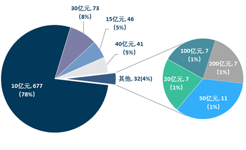 根據上述關于申報企業預計市值的規定,本次統計的869家申報企業選擇的上市標準中,預計市值的分布情況為:677家選擇10億元人民幣,73家選擇30億元人民幣,46家選擇15億元人民幣,41家選擇40億元人民幣,11家選擇50億元人民幣,7家選擇20億元人民幣,7家選擇100億元人民幣,7家選擇200億元人民幣。