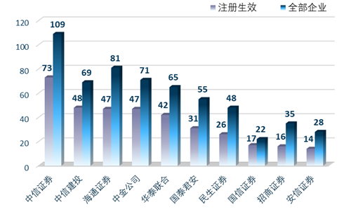 共有54家保薦機構承擔了516家注冊生效公司的保薦業務,中信證券(73單)領居首位,排在第二位的是中信建投(48單),海通證券/中金公司以相同的47單并列第三。