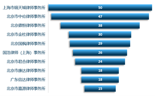 共有68家會計事務所為本次統計到的516家注冊生效企業提供法律服務,TOP1為上海市錦天城律師事務所(50單),TOP2為北京市中倫律師事務所(47單),TOP3為北京德恒律師事務所(68單)。