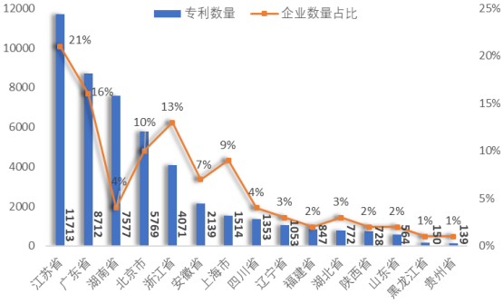 如圖3所示,在各地區的專利申請總數量排名中,排名前五的地區依次為:江蘇省、廣東省、湖南省、北京市、浙江省,與地區分布的企業數量排名基本一致。