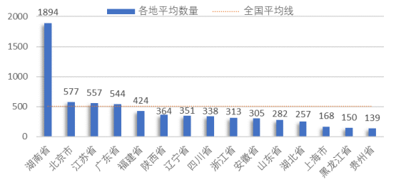 從地區平均高價值有效中國發明專利量的角度來看,如圖7,高于全國平均水平(78件)的地區有4個,依次為:湖南省(477件)、福建省(163件)、北京市(120件)、四川省(84件),地區擁有高于全國平均水平的高價值專利數量,對打造地區產業集群發展有積極的影響帶動作用。