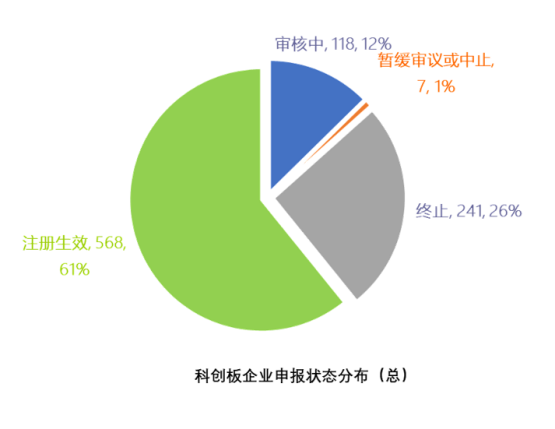 截止到2023年08月09日,科創(chuàng)板共計(jì)申報企業(yè)934家。其中注冊生效568家,終止(包括終止、終止注冊、不予注冊)241家,審核中(包括已受理、已問詢、上市委會議通過、提交注冊)118家,暫緩審議或中止7家。