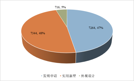 在科創(chuàng)板注冊生效的23家新能源企業(yè)專利申請超過1.5萬件,平均每家注冊生效的企業(yè)擁有專利超600件。申請的專利中以發(fā)明和實(shí)用新型為主且數(shù)量相差不大,分別為7264以及7344件,外觀設(shè)計(jì)較少有716件。