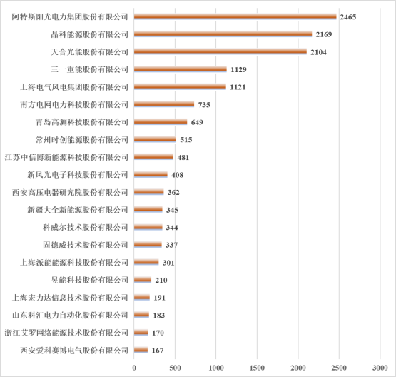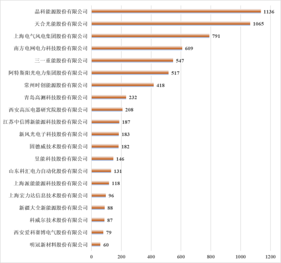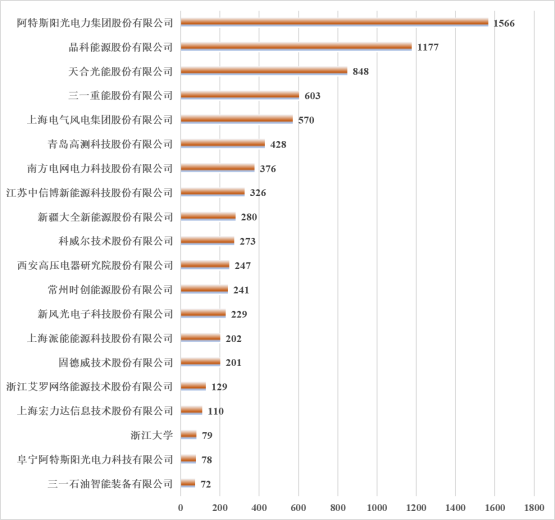 經(jīng)統(tǒng)計(jì),目前申請的約1.5萬件專利中,有超過8600件專利處于授權(quán)狀態(tài),平均每家注冊生效企業(yè)有近380件授權(quán)專利。其中,阿特斯陽光電力集團(tuán)股份有限公司(1566件)、晶科能源股份有限公司(1177件)、天合光能股份有限公司(848件)、三一重能股份有限公司(603件)、上海電氣風(fēng)電集團(tuán)股份有限公司(570件)以及青島高測科技股份有限公司(428件)六家企業(yè)授權(quán)專利數(shù)量在平均值以上。