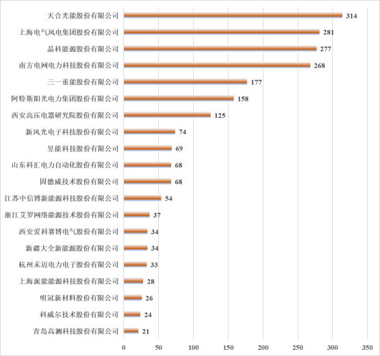 經(jīng)統(tǒng)計(jì),新能源領(lǐng)域科創(chuàng)板注冊生效的企業(yè)申請的發(fā)明專利中,有近2500件處于授權(quán)狀態(tài),平均每家超過100件。其中,授權(quán)量在300件以上的有一家,為天合光能股份有限公司(314件);授權(quán)量在200件以上300件以下的有3家,分別為上海電氣風(fēng)電集團(tuán)股份有限公司(281)、晶科能源股份有限公司(277)以及南方電網(wǎng)電力科技股份有限公司(268件)。