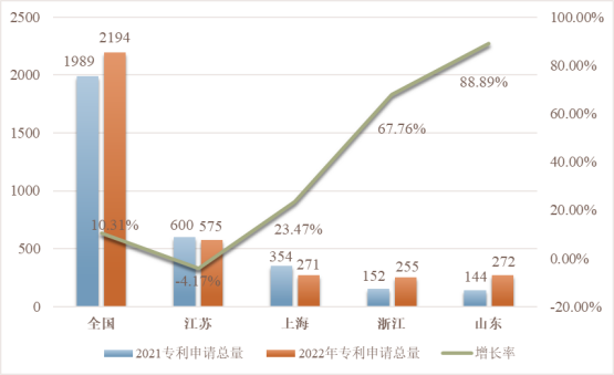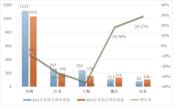 對全國、江蘇、浙江、上海以及山東的專利申請情況進(jìn)一步分析發(fā)現(xiàn),2022年,全國、浙江、山東專利申請總量較2021年有所提升,以山東增幅最高,為88.89%,江蘇、上海則呈現(xiàn)負(fù)增長(見圖7)。從發(fā)明專利申請情況來看,山東同樣增幅最多,為29.27%,全國、江蘇、上海呈現(xiàn)負(fù)增長。出現(xiàn)負(fù)增長與2022年專利未完全公開有一定的關(guān)系(見圖8)。
