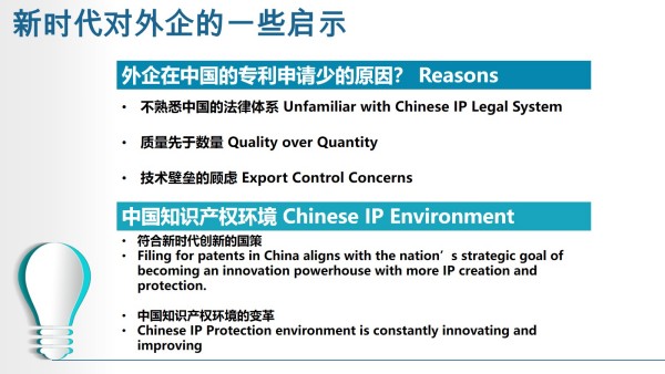 薛律師提到,在全球產業鏈呈現本土化和區域化趨勢下,專利布局是少數有效的競爭和制約工具,與產業鏈重構相比,知識產權布局有足夠的靈活性。同時,針對在華外企,薛律師表示外企在中國的專利申請少的原因主要是因為對中國法律體系的不熟悉、對技術壁壘的顧慮等因素,但實際上中國知識產權環境也在根據新時代新情況不斷發生變化,在華外企可以通過專業律師以合適的申請策略,來實現其知識產權的創新與保護。
