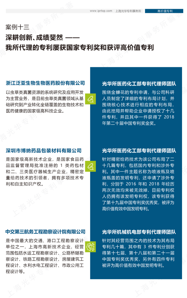 案例十三總結了光華所代理的獲國家專利獎和獲評高價值專利的案例。光華所一路走來服務了幾千家客戶,不斷為客戶創造高效價值。光華所堅守讓知識產權成為客戶優勢與價值的使命,幫助企業真正認識到專利的價值,并通過高質量的代理服務,打造高價值專利,助推企業快速發展。