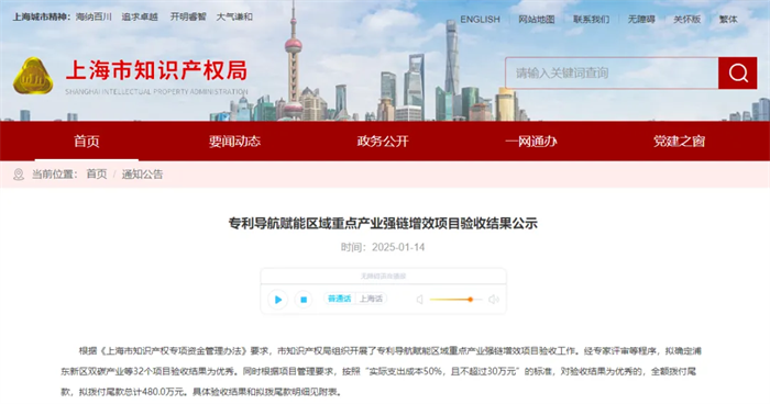 2025年1月14日,上海市知識產權局公布了專利導航賦能區域重點產業強鏈增效項目驗收結果公示。