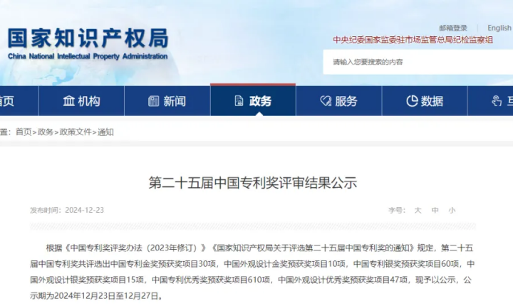 2024年12月23日,國家知識產(chǎn)權(quán)局公示第二十五屆中國專利獎評審結(jié)果,共評選出中國專利金獎預(yù)獲獎項目30項,中國外觀設(shè)計金獎預(yù)獲獎項目10項,中國專利銀獎預(yù)獲獎項目60項,中國外觀設(shè)計銀獎預(yù)獲獎項目15項,中國專利優(yōu)秀獎預(yù)獲獎項目610項,中國外觀設(shè)計優(yōu)秀獎預(yù)獲獎項目47項。