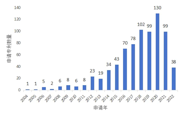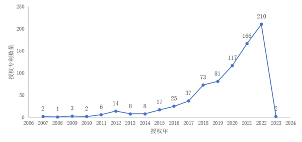 從本屆獲獎專利授權(quán)數(shù)量來看,授權(quán)年限主要集中在2018-2022年,占比83%。最早授權(quán)年2007年,其中2022年達到210件最多。