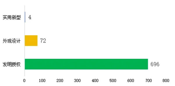 從本屆獲獎專利申請類型來看,發(fā)明696件占據(jù)絕對優(yōu)勢,外觀72件,占比9%,實用新型4件,相對較少。