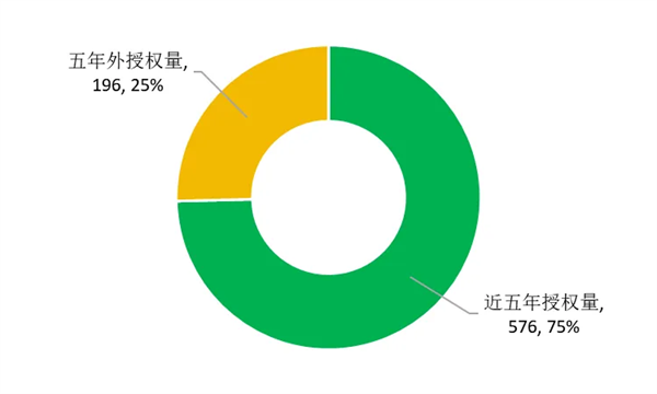 從本屆獲獎專利授權(quán)統(tǒng)計年限來看,近五年授權(quán)量共計576件,占比達75%。