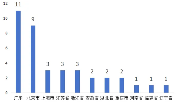 從本屆獲獎專利分布地域來看,主要集中在廣東、北京、江蘇、浙江、山東、上海等東南沿海經(jīng)濟較發(fā)達的省市。
