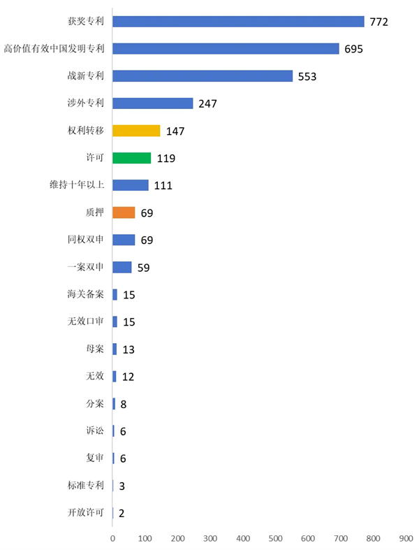 從授權(quán)年限來看,授權(quán)專利黃金年齡1-5年。從獲獎數(shù)量看,發(fā)明占有絕對優(yōu)勢,外觀設(shè)計其次,實用新型的獲獎數(shù)量總量較少,且呈遞減趨勢。專利運營數(shù)量整體占比較高,突顯高價值專利產(chǎn)業(yè)化的經(jīng)濟導(dǎo)向。涉外專利增加明顯,是衡量專利價值的一個重要指標。