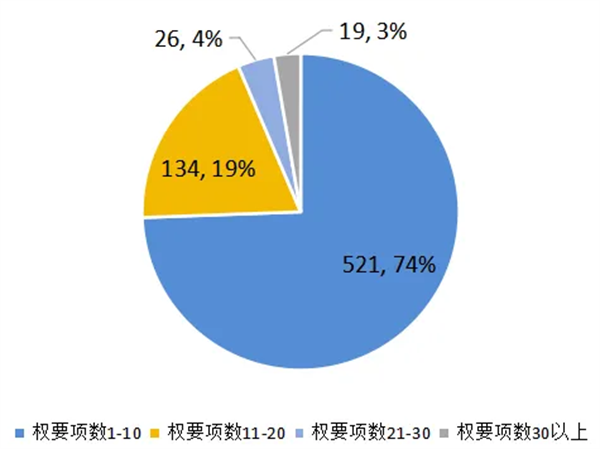從本屆獲獎專利權(quán)利要求數(shù)量統(tǒng)計來看,專利權(quán)利要求數(shù)量主要集中在20項以內(nèi)。權(quán)要30項以上占比3%,相對較少。