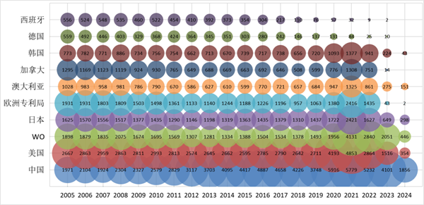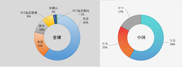 全球專利申請失效專利占比偏大,授權有效和審中專利占比較小,目前的創新趨勢不高。PCT專利申請在10%以下,全球專利流通一般?;乜粗袊@急扰c全球一致,審中和有效專利占比都有一定提高,結合前述申請趨勢,可見中國在該領域技術發展相對全球平均水平更活躍。