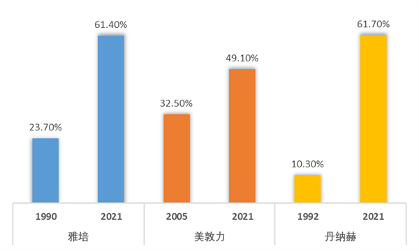 90年代以來,海外醫療器械龍頭國際化水平整體呈現逐年提升的態勢,尤其是龍頭企業。下圖為雅培、美敦力、丹納赫近年來國際化水平變化數據,海外營收是這些企業打開成長空間的關鍵所在,企業借助國際化布局升級為全球醫療器械龍頭。