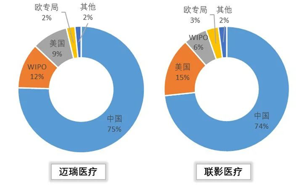 結合兩家公司目前的海外專利布局情況,邁瑞醫療、聯影醫療的研發創新技術在海外專利布局占比情況不相上下,其中,美國市場對聯影醫療較為重要,其美國的專利布局高達15%。