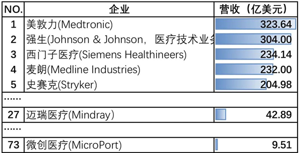 Medical Design & Outsourcing發布2024年全球醫療器械百強榜單,美敦力、強生、西門子蟬聯營收前三,營業收入分別為323.64億美元、304.00億美元、234.14億美元。中國醫療器械企業共有兩家入選,分別是邁瑞醫療(42.89億美元)和微創醫療(9.51億美元),對比中國企業和榜首的營收數據,不難發現,即使是中國龍頭企業,與榜首的營收差距也十分明顯。