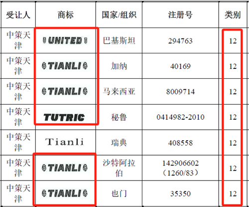 2)中策橡膠(天津)有限公司(以下簡稱“中策天津”)是發行人的全資子公司,中策天津自天津國際聯合輪胎橡膠股份有限公司(以下簡稱“天津國際”)受讓的境外商標的轉讓手續未完成