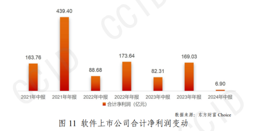 根據賽迪發布《我國軟件上市公司2024年半年報簡析》來看,2024年上半年,軟件上市公司利潤增長欠佳,上半年合計6.90億元,同比下跌91.62%。統計的354家公司中,實現盈利178家,錄得虧損176家。