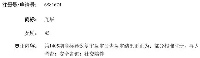 1)在第6881674號(hào)商標(biāo)中,該商標(biāo)本身存在由于商標(biāo)局登記失誤而導(dǎo)致的權(quán)利人信息錯(cuò)誤。該商標(biāo)作為引證商標(biāo)所有人“蘇州華光法律咨詢服務(wù)有限公司”最早的商標(biāo)權(quán),即第6881674號(hào)商標(biāo)曾經(jīng)被他人提出異議,并且4506群組法律服務(wù)下相關(guān)服務(wù)項(xiàng)目已經(jīng)被撤銷,由于商標(biāo)局登記失誤,導(dǎo)致其一直為有效狀態(tài),光華所發(fā)現(xiàn)后,及時(shí)向商標(biāo)局作出說明,該商標(biāo)在4506群組下的商標(biāo)權(quán)自始不存在,不應(yīng)當(dāng)對(duì)我所商標(biāo)構(gòu)成注冊(cè)障礙。