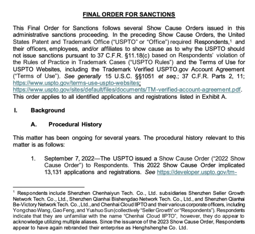 美國(guó)專(zhuān)利商標(biāo)局對(duì)一家外國(guó)申請(qǐng)公司(中國(guó)深圳SG及其關(guān)聯(lián)公司)實(shí)施制裁,終止 52,000 余件與該公司相關(guān)聯(lián)的涉嫌欺詐取得或維持的商標(biāo)申請(qǐng)及注冊(cè)。
