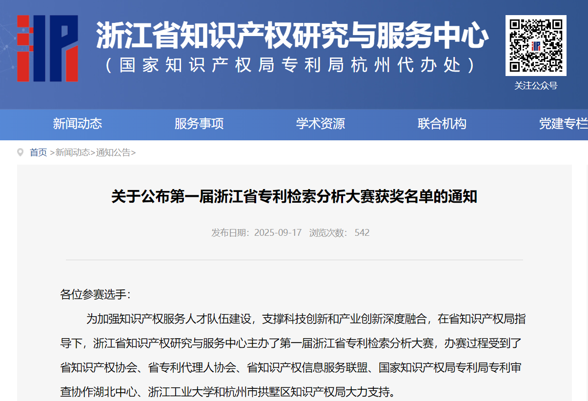 近日,由浙江省市場(chǎng)監(jiān)管局(省知識(shí)產(chǎn)權(quán)局)指導(dǎo)、省知識(shí)產(chǎn)權(quán)研究與服務(wù)中心主辦的第一屆“浙江省專利檢索分析大賽”獲獎(jiǎng)名單正式公布并順利舉行了頒獎(jiǎng)活動(dòng)。
