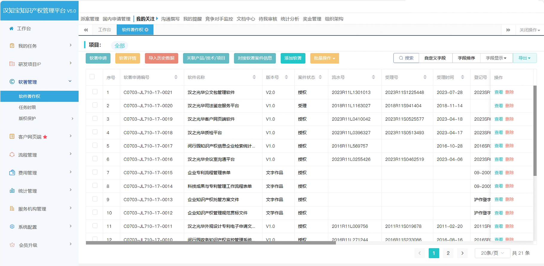 企業軟著管理軟件的各項功能,例如軟著申請、案件操作臺,任務時限、文檔中心、賬單管理、統計分析、預算管理、獎金管理、服務機構管理,軟著保護,軟著運營,均已融入漢知寶企業知識產權管理平臺。
