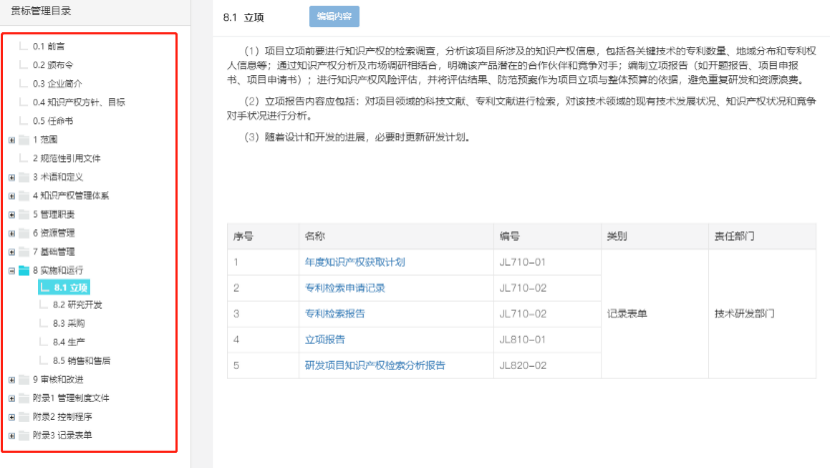 包括:知識產權方針、目標;知識產權管理體系、管理職責、資源管理、基礎管理、實施和運行、審核和改進等。
