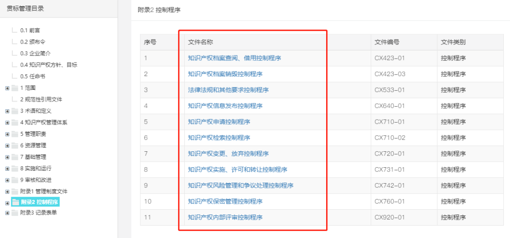 系統預設需要形成程序的文件,控制程序是知識產權管理過程中的具體要求,為進行某項活動或過程所規定的途徑。
